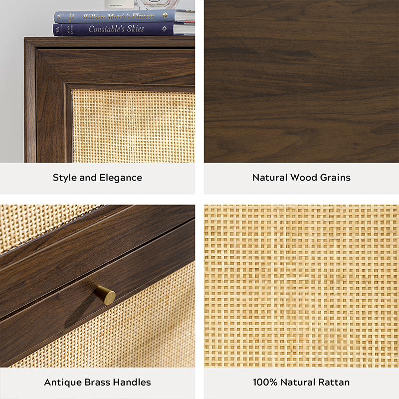 | مادة | لوح من الخشب الصلب مع لمسة نهائية من MDF وزخرفة من الروطان الحقيقي |