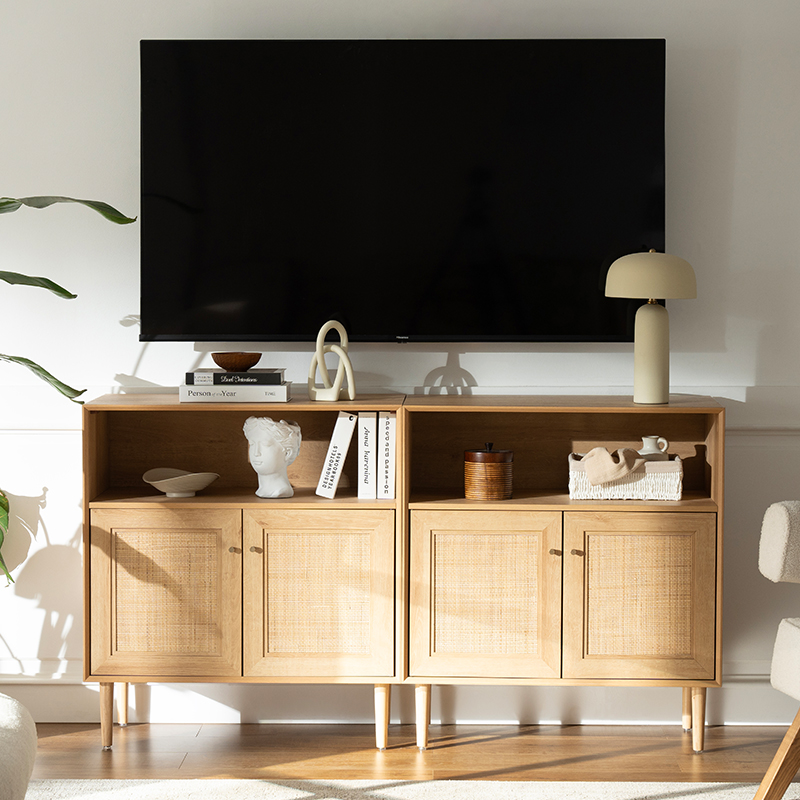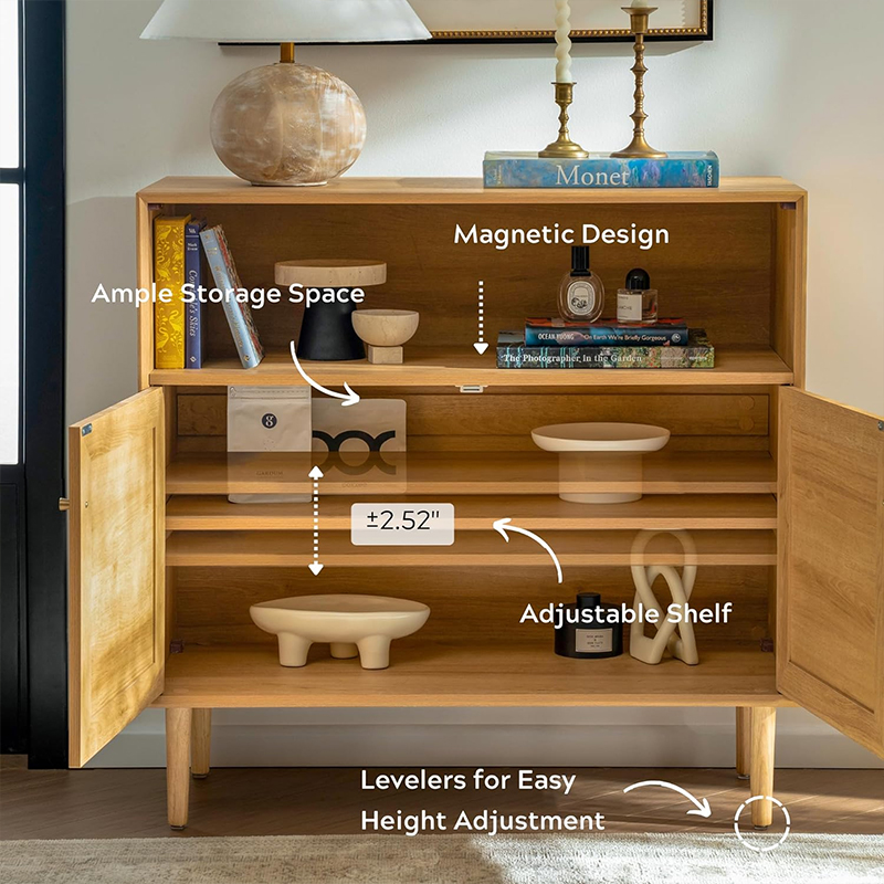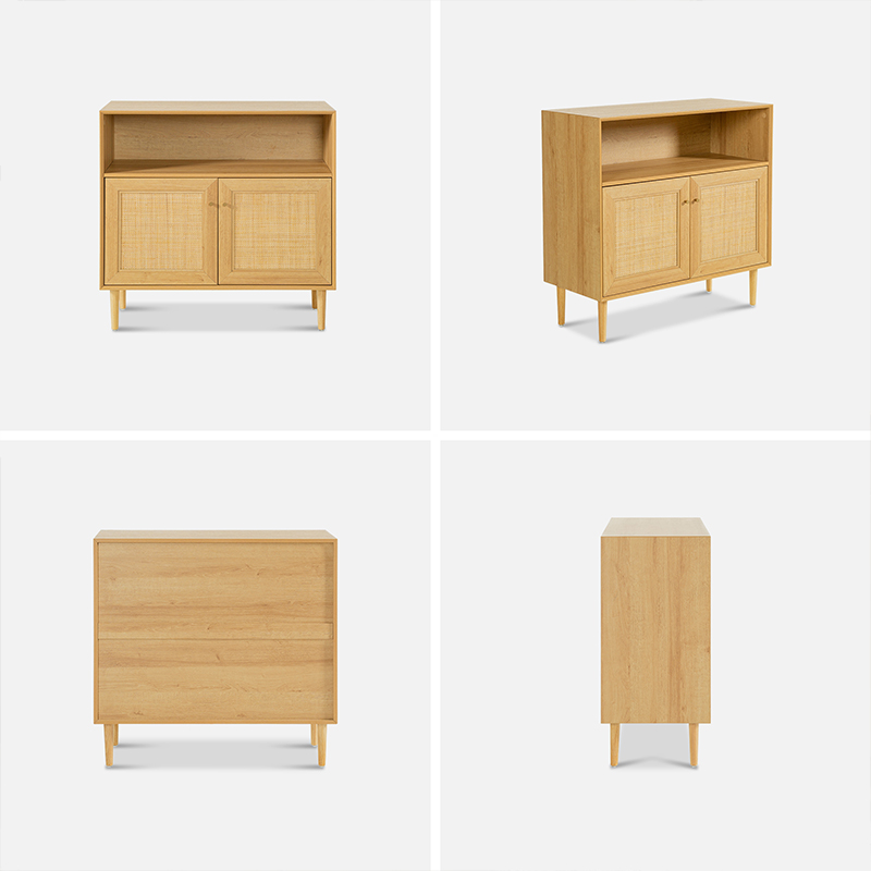 تتميز الخزانة ببابين مصنوعين من مادة الروطان عالية الجودة والمعروفة بمتانتها وقوتها. تفتح الأبواب بسلاسة وتوفر سهولة الوصول إلى حجرات التخزين الواسعة بالداخل. تم تصميم الخزانة بمظهر ريفي يضيف لمسة من الدفء والرقي إلى أي غرفة.
