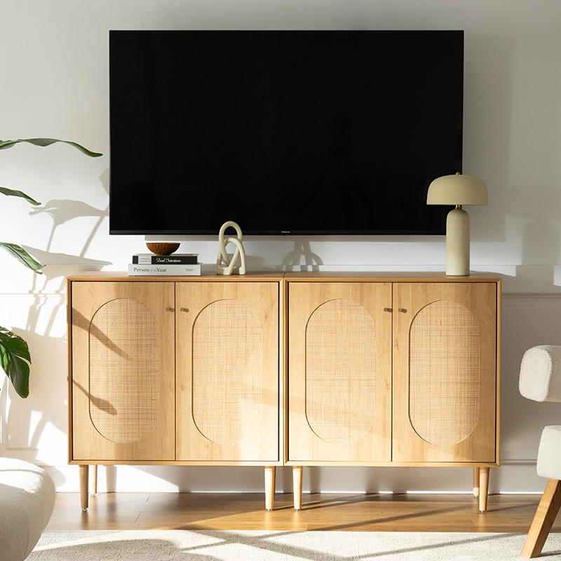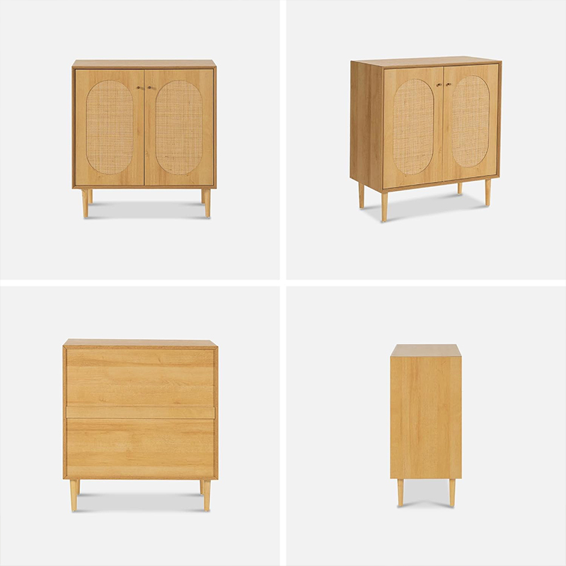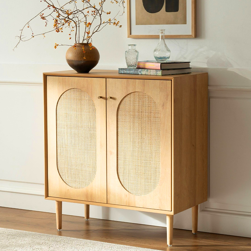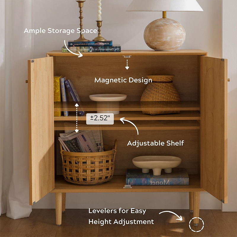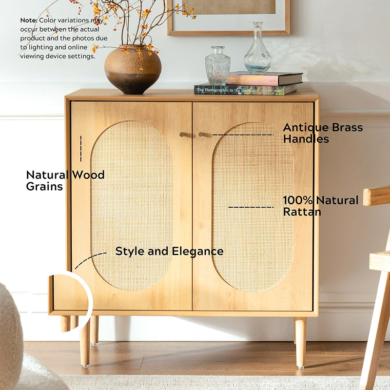 إحدى المزايا الرئيسية لهذه الخزانة هي وظيفتها. مع بابين يفتحان ليكشفا عن مساحة داخلية واسعة، تعد هذه الخزانة جيدة لتخزين مجموعة واسعة من العناصر، بما في ذلك الكتب والملابس واللوازم المنزلية. بالإضافة إلى ذلك، توفر تفاصيل الروطان على الأبواب لمسة فريدة وأنيقة تكمل أي ديكور.